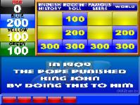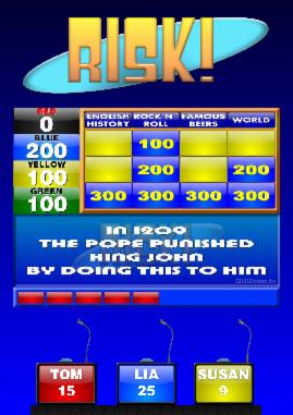 correct question in the form: What is…?, Where is…?, Who is….?For example: The “question” is: The best game show system in the market Your “answer” is: What is Quiztion,TV? Four people play three rounds of quizzes to determine the champion. Each round would have four categories, each with 3 questions (answers) of varying difficulty and point value. Whoever got the last question (answer) right gets to choose next and they will continue until all the answers (questions) have been used up. Round 2 play for double points Round 3, final risk, where people bet all, some, none of their winnings on one final question (answer) in order to win. |